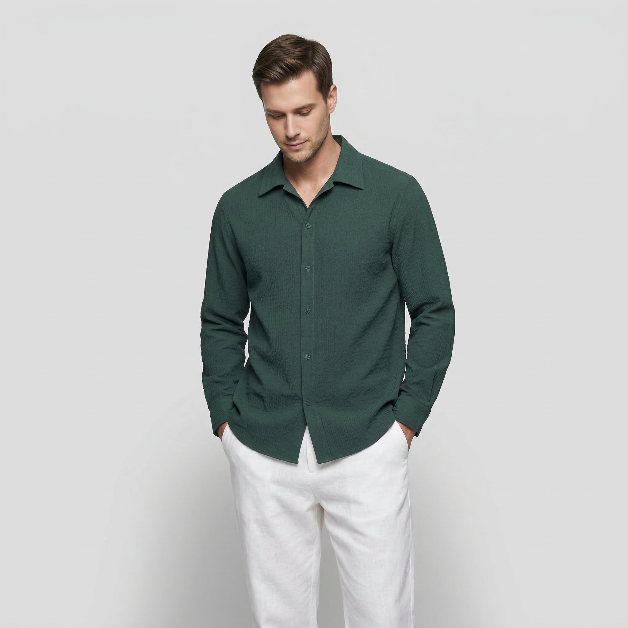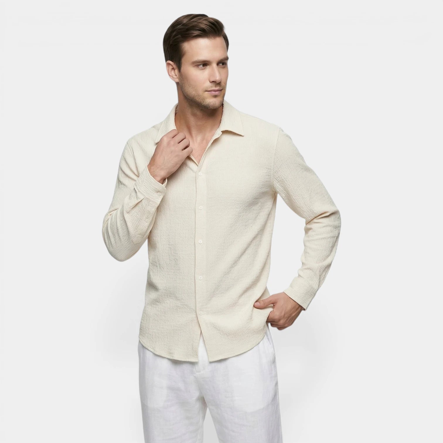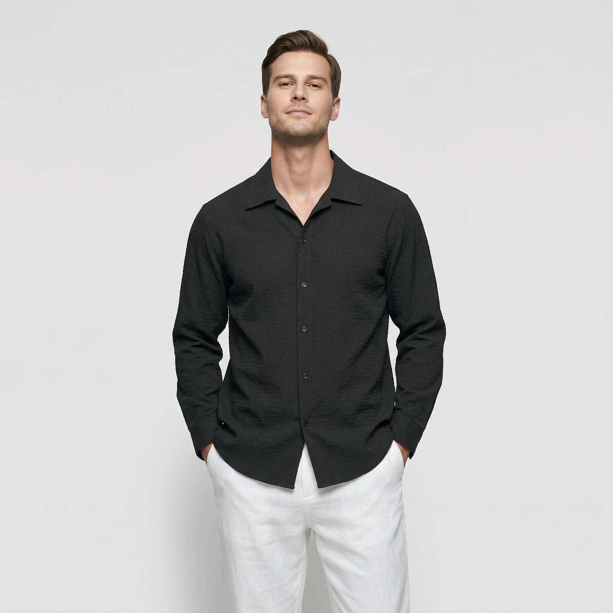 This men's button-down shirt offers a neat and tidy look with a subtle all-over texture that adds visual depth without overwhelming the design. It features a classic collar and a full-length button closure for a structured presentation. The long sleeves with buttoned cuffs and slightly rounded hem suggest a straight and regular fit. Pair it with dress pants or jeans for a balanced and polished outfit.