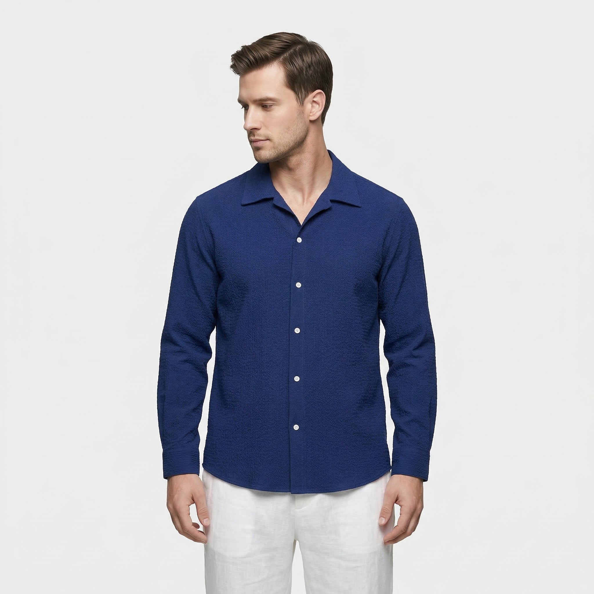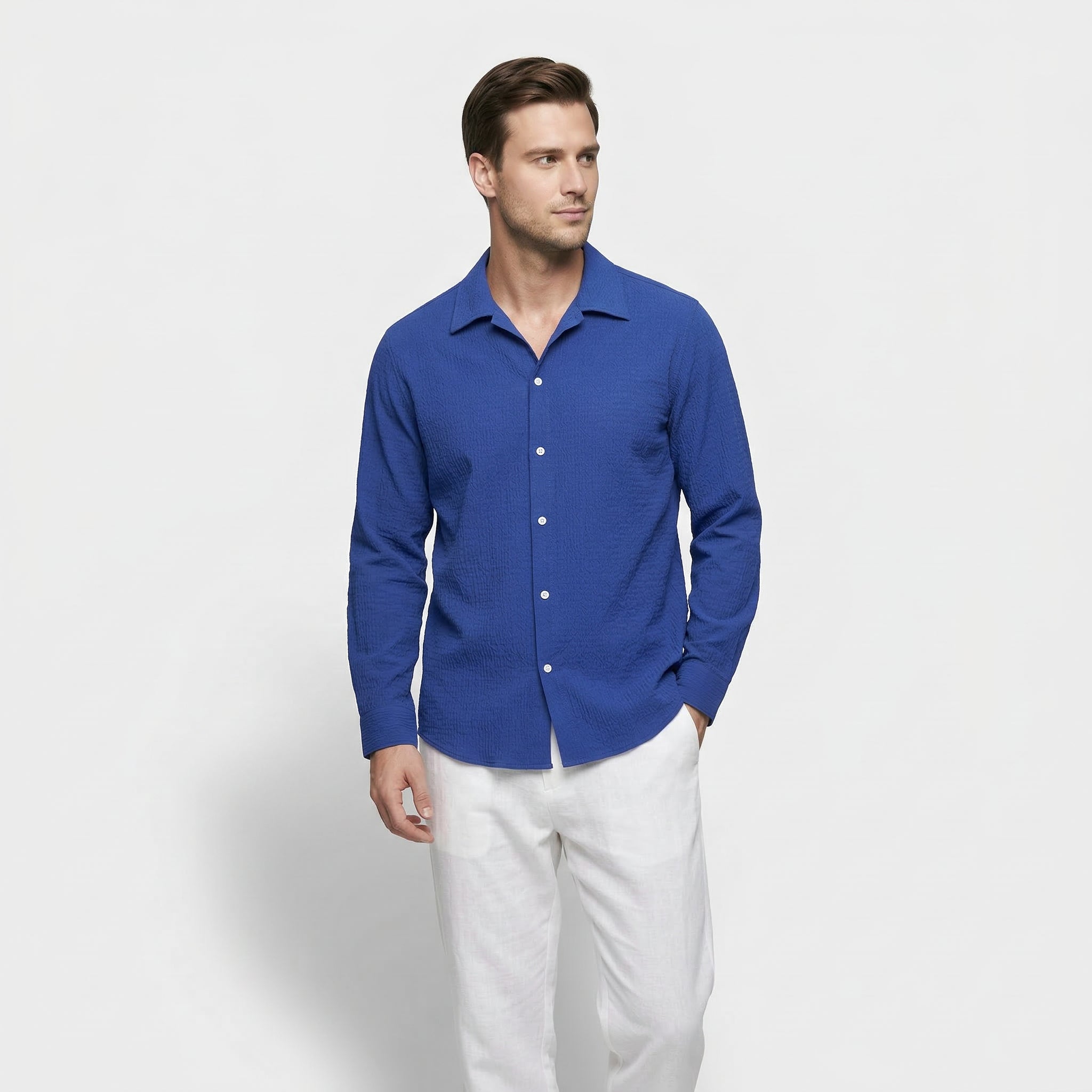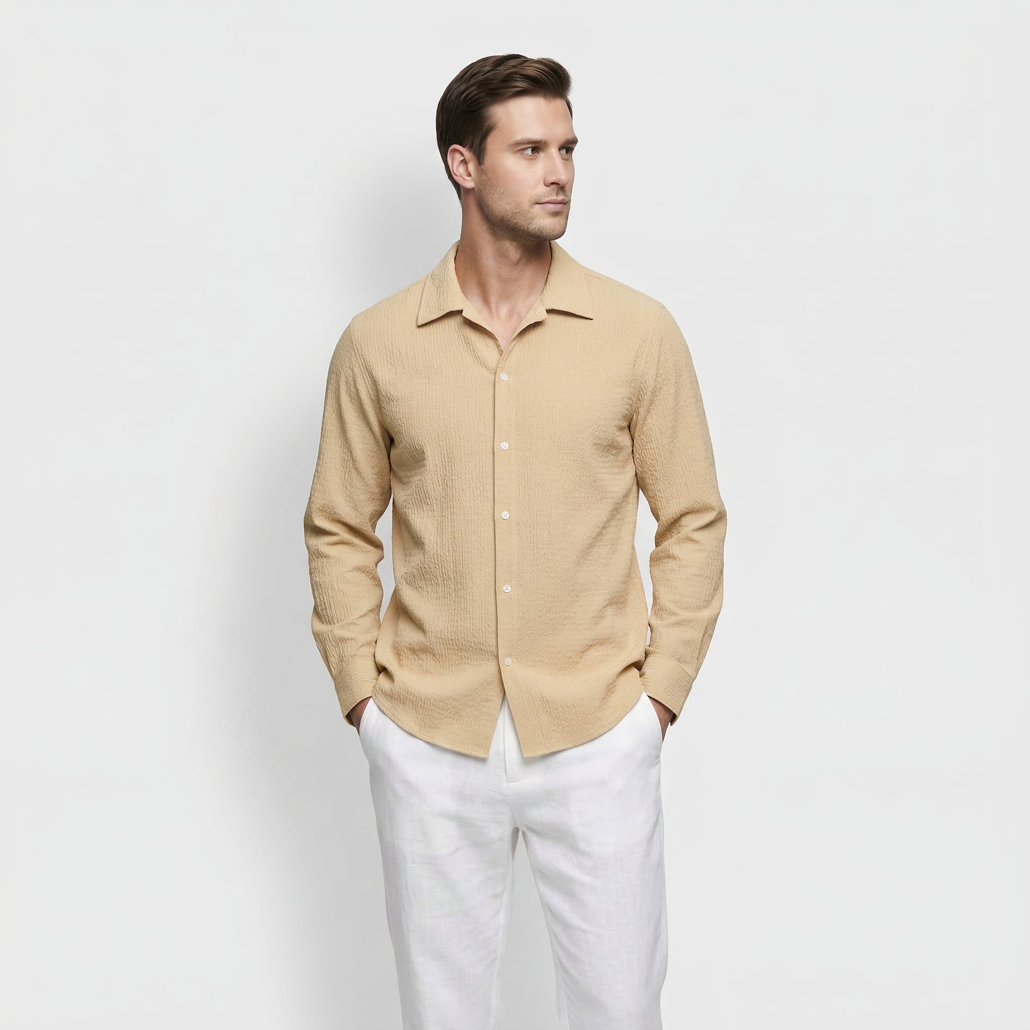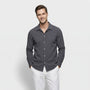 This men's button-down shirt offers a neat and tidy look with a subtle all-over texture that adds visual depth without overwhelming the design. It features a classic collar and a full-length button closure for a structured presentation. The long sleeves with buttoned cuffs and slightly rounded hem suggest a straight and regular fit. Pair it with dress pants or jeans for a balanced and polished outfit.