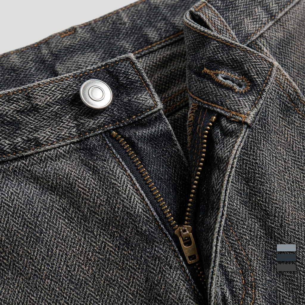 - Zipper fly with button closure: classic fastening for reliable support