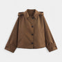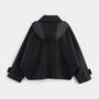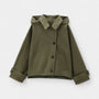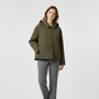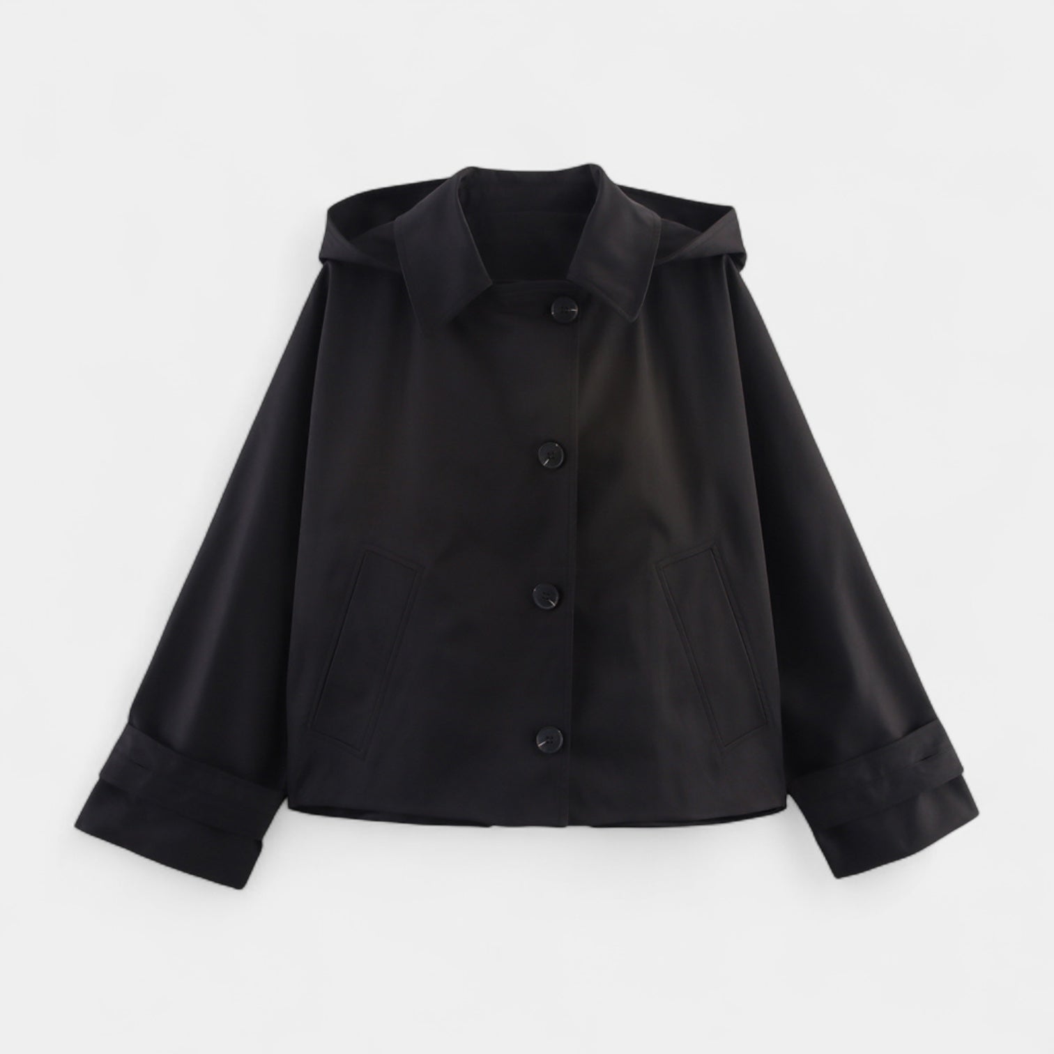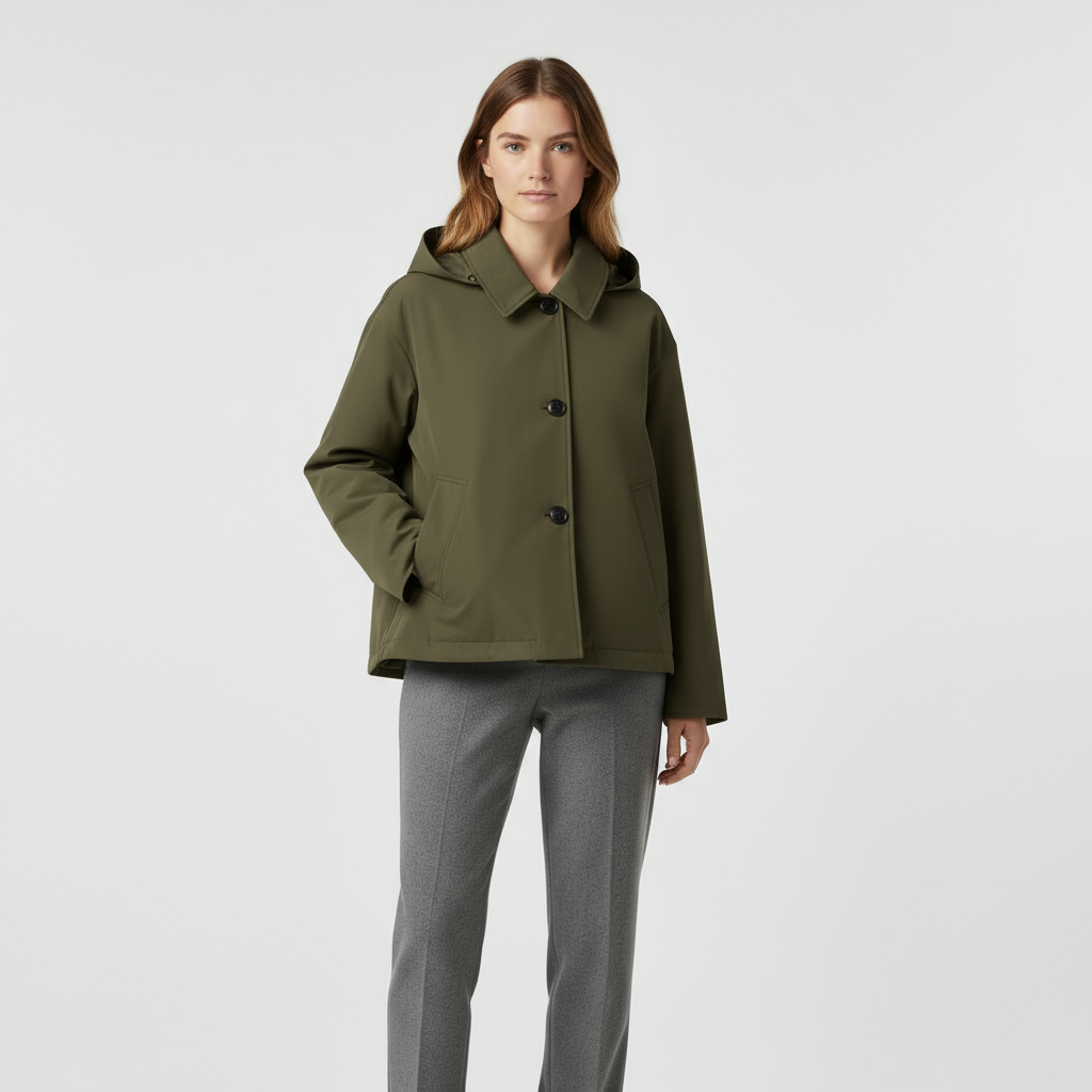 Cette veste pour femme en tissu technique à finition lisse présente une silhouette courte et légèrement ample, avec des épaules douces et des manches longues au volume souple. Le col chemise structure la ligne, complété par une capuche intégrée qui ajoute une dimension fonctionnelle sans alourdir l’ensemble. La fermeture boutonnée sur le devant et les poches plaquées verticales signent un esprit minimal, facile à porter sur des pièces ajustées ou des mailles fines, pour des looks quotidiens épurés.
