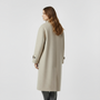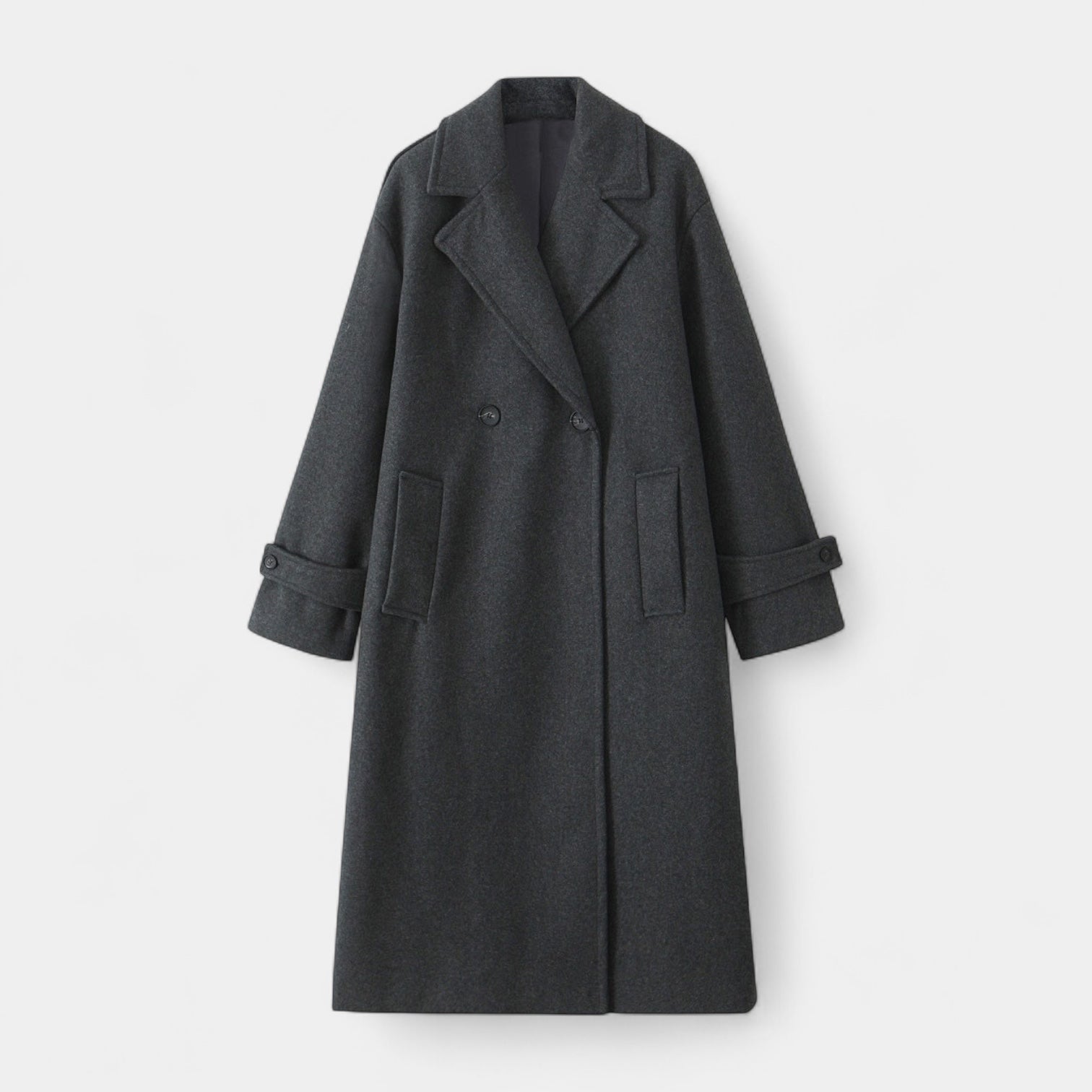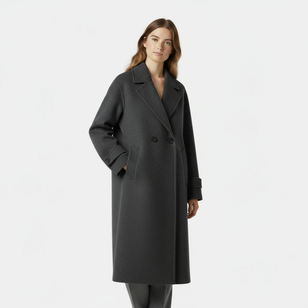 Ce manteau pour femme en laine à l’aspect feutré présente une coupe longue et droite, structurée par un design croisé et de larges revers tailleur. L’épaule est légèrement tombante pour une aisance moderne, tandis que la fermeture boutonnée sur le devant maintient une allure épurée. Des poches verticales passepoilées et des pattes boutonnées aux poignets complètent la pièce, pensée pour se porter facilement sur une maille ou un blazer, en ville comme au quotidien.