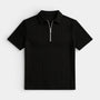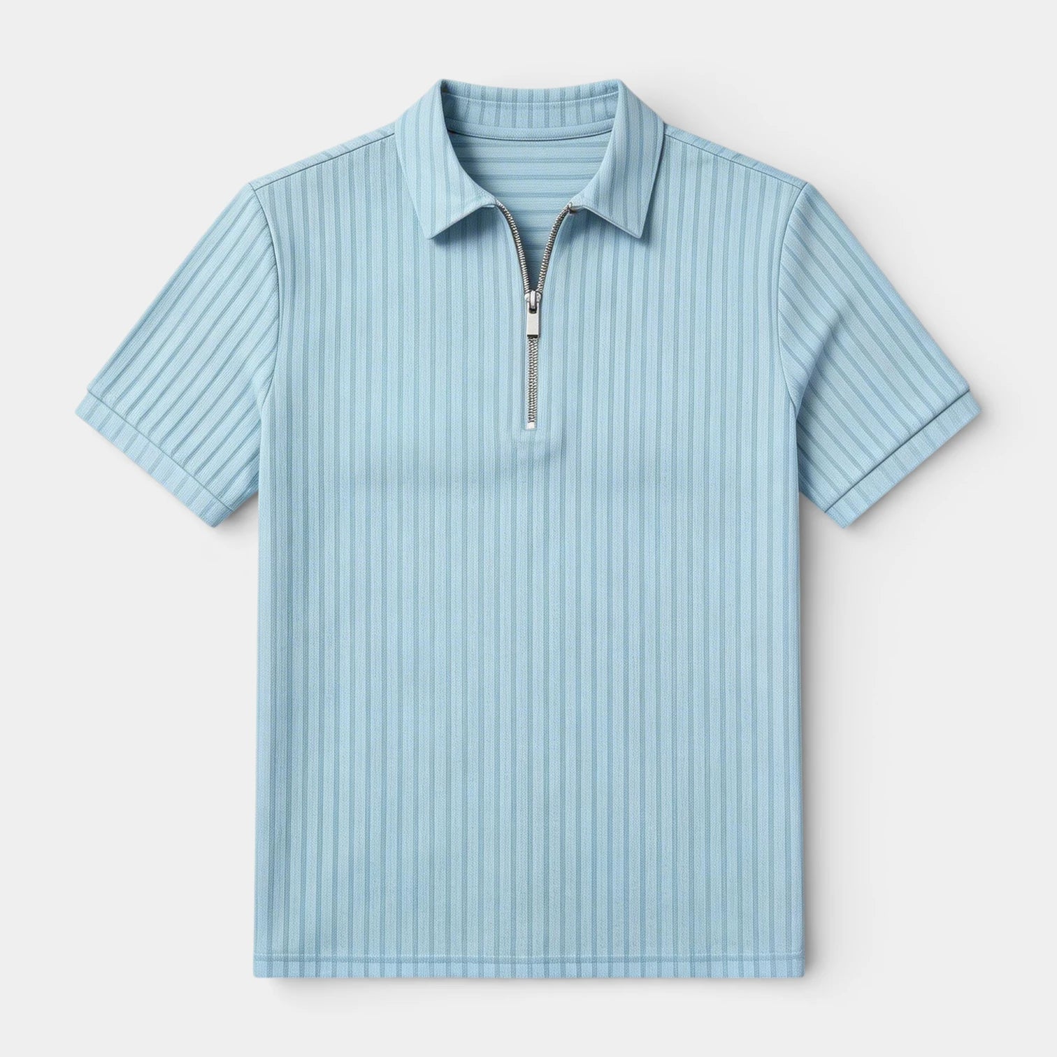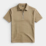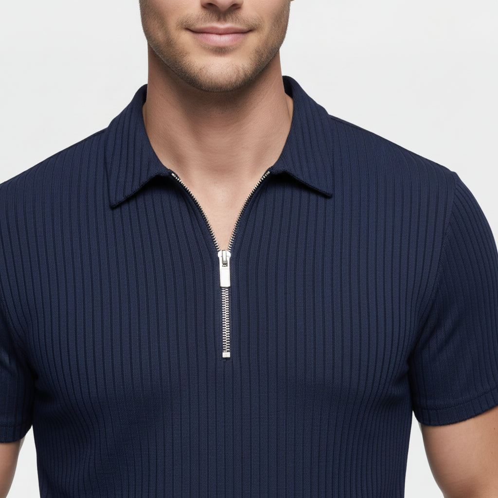 Ce polo homme en maille côtelée présente une silhouette nette et actuelle avec un col structuré et une fermeture zippée courte à l’avant. La texture côtelée verticale s’étend sur l’ensemble du vêtement, créant un relief visuel et une surface plus travaillée. Les manches courtes et la coupe droite suggèrent une silhouette classique qui maintient une ligne équilibrée. Il s’associe facilement avec un pantalon habillé, un jean ou sous une veste légère pour composer des tenues harmonieuses.