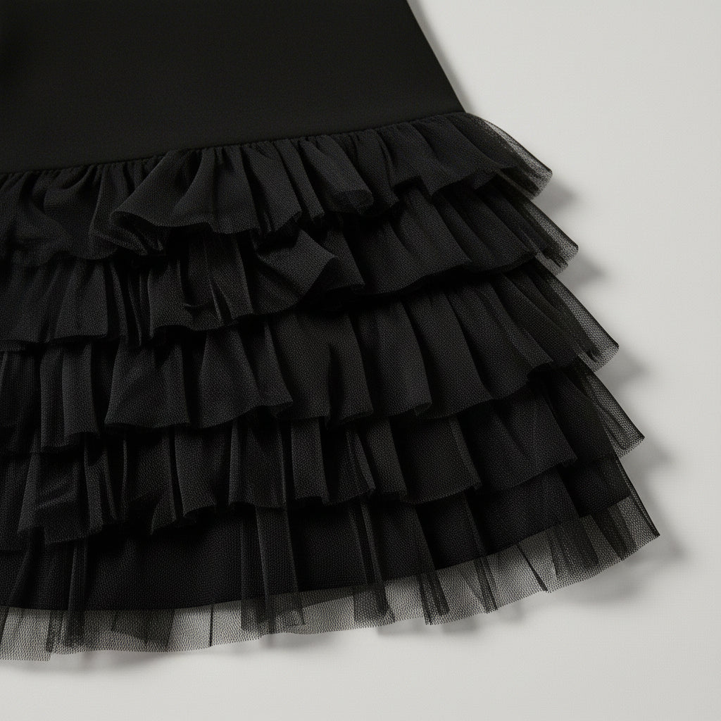 - Bords de volants en tulle superposé: niveaux froncés légers qui ajoutent de la profondeur à la jupe afin de renforcer le fini raffiné.