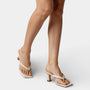 Ces sandales à talon pour femme présentent une allure nette et sculptée définie par un bout carré et une bride incurvée unique sur le dessus du pied. La conception ouverte à enfiler met en valeur la tige minimaliste tandis que le talon de hauteur moyenne crée un profil élégant. La surface lisse et la construction simple soulignent la ligne contemporaine du modèle. Associez-les à un pantalon tailleur, une jupe ou une robe pour compléter une tenue au rendu soigné.